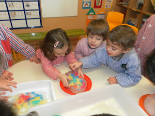 Em seguida colocámos o Gelo num tabuleiro e depois da Piedade nos dar sal de cozinha, salgámos as nossas rochas de gelo, quer dizer, passamos o sal por cima do gelo. Esperámos um pouco e ...eureka! vimos que havia "buraquinhos" no gelo, pareciam túneis. para vermos melhor os túneis de gelo, deitámos tinta colorida e ficámos a observar a tinta a escorrer pelos caminhos feitos com o sal no gelo. que espetáculo de cores.