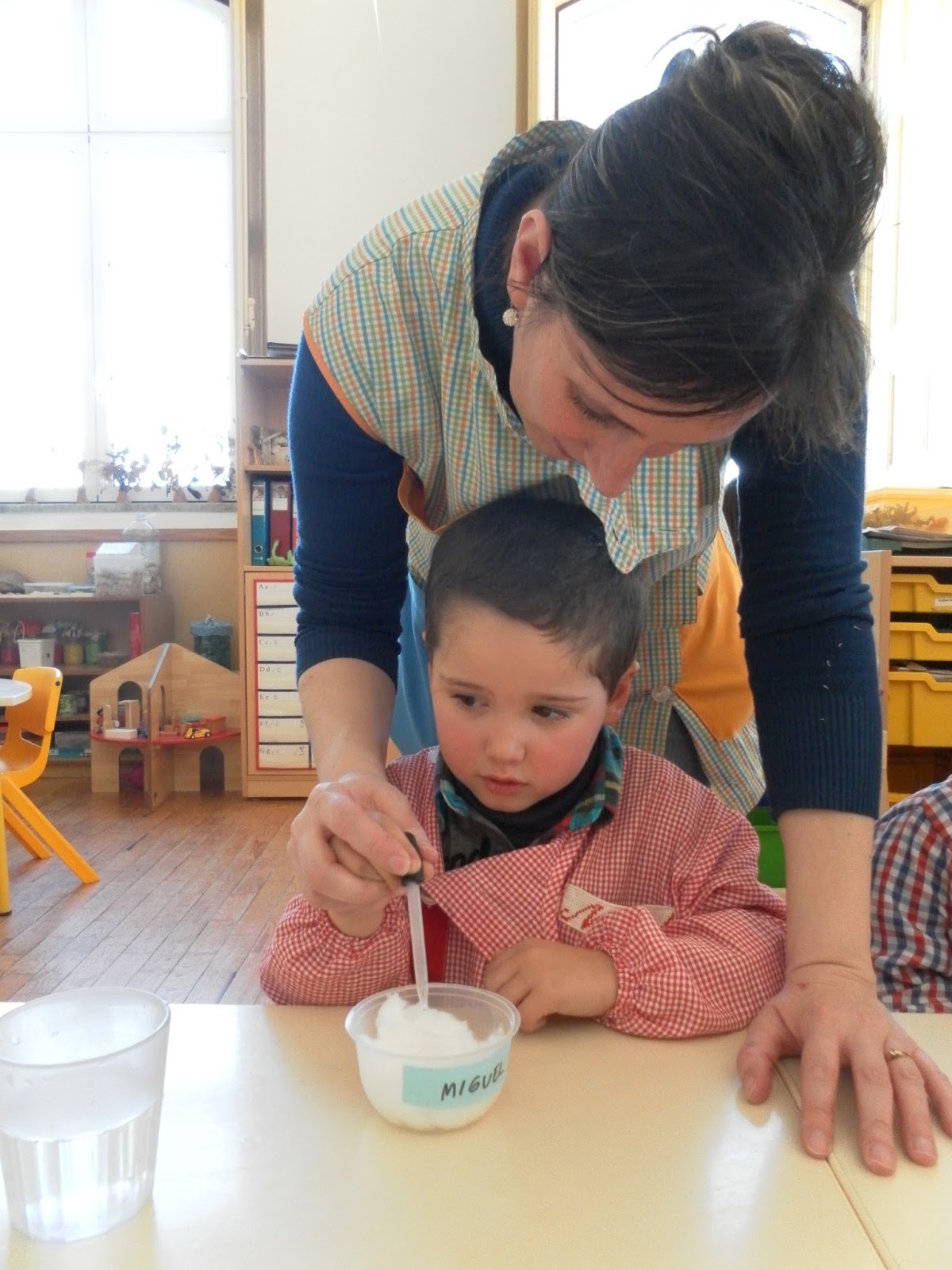neste momento iniciámos já os trabalhos sobre a Páscoa. sendo tempo de renascimento, começámos mais uma vez, depois de ouvir a história nova- "João e o Pé de Feijão", a experiência da germinação do feijão. colocámos um feijão numa caminha de algodão e regámos com conta-gotas; por enquanto ainda não observámos alterações no feijão.