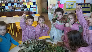 contámos e partimos galhos para a fogueira de S Martinhodepois pintámos galhos, cascas de frutos secos, folhas