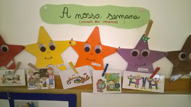 no âmbito do dia Mundial da Alimentação, trabalhámos a história da Lagartinha Comilona, aproveitando não só para falar sobre a alimentação saudável mas também sobre os números até cinco e os dias da semana aos quais atribuímos uma casa/cor , como podemos ver nos desenhosfizemos também uma Lagartinha para brincar na Oficina do Sr Lixo e molduras de Frutas com cartão e papel de revistas